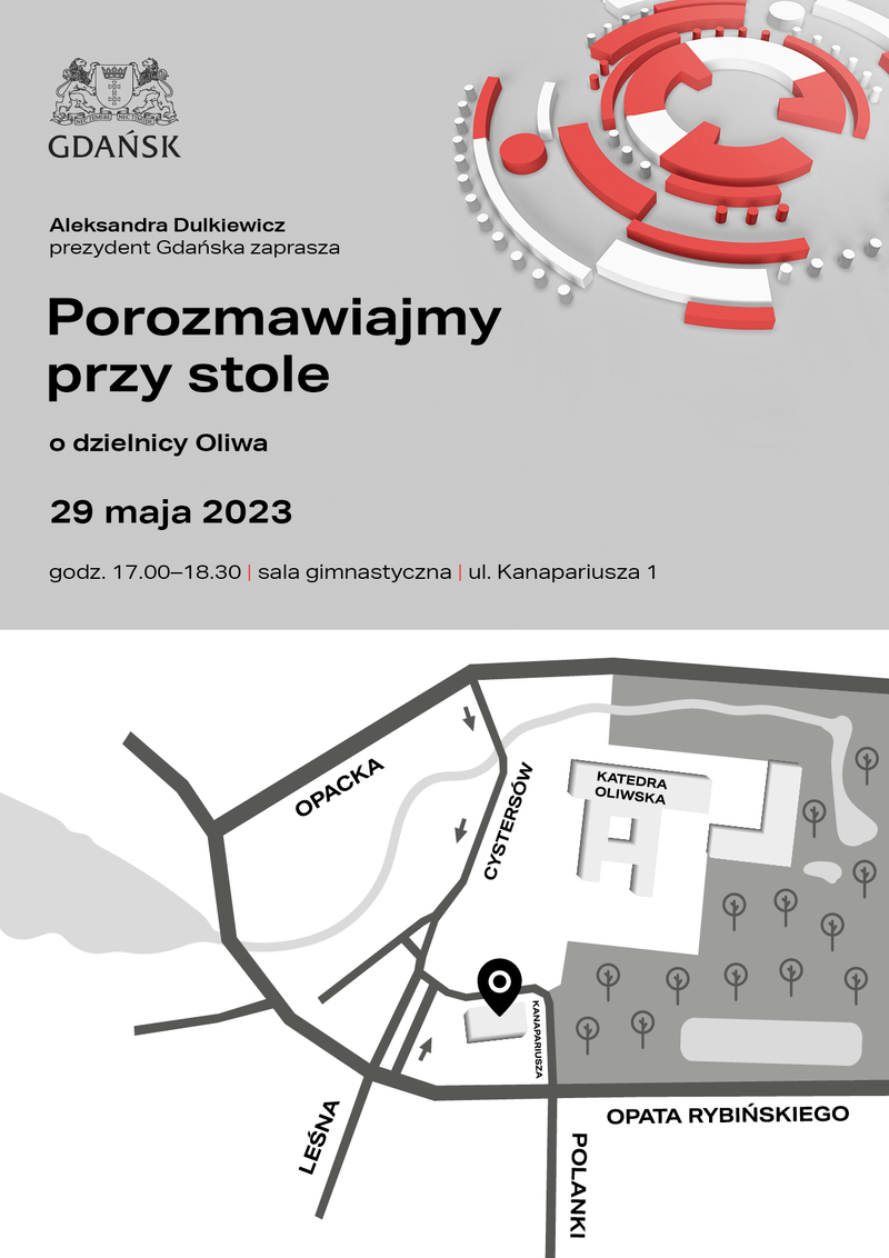 W dniu 29 maja 2023 r. w godz. 17.00-18.30 w sali gimnastycznej przy ul. Kanapariusza 1 odbędzie się spotkanie prezydent Aleksandry Dulkiewicz z cyklu: „Porozmawiajmy przy stole” z mieszkańcami dzielnicy Oliwa.