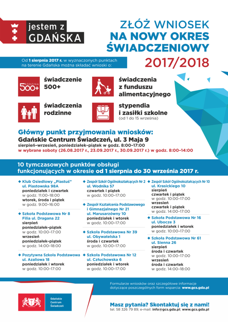 1 sierpnia Gdańskie Centrum Świadczeń rozpoczyna akcję przyjmowania wniosków o świadczenie 500+, świadczenia rodzinne oraz świadczenia z funduszu alimentacyjnego. Aby ułatwić złożenie wniosków uruchomionych zostanie 11 punktów obsługi, rozlokowanych w różnych dzielnicach Gdańska.